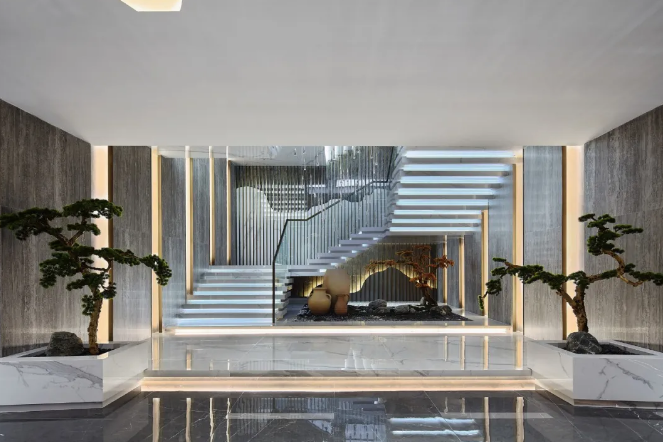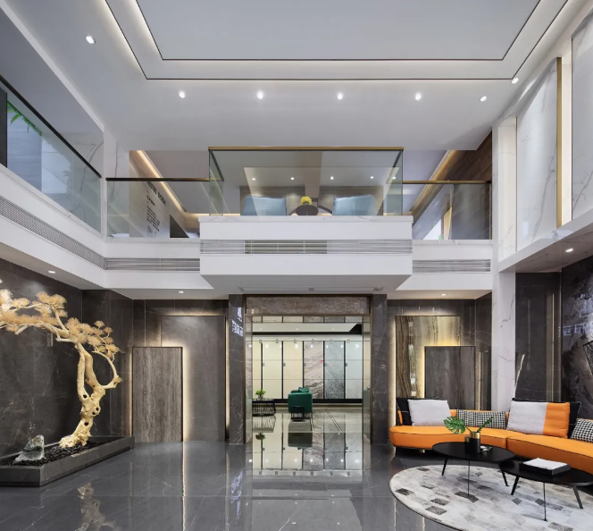 陶瓷展廳設計效果圖本案例位于深圳,展廳為臨街鋪位,室內層高6.28米,分上下兩層,一層層高3.43米,夾層層高2.75米。本案初期現場勘察發現,原鋼結構樓梯在平面左下角,對于展廳的參觀動線不理想。另外比較嚴重的問題是,夾層建筑梁底的凈高只有2.17米,現場視覺很壓抑。我們將兩層空間混合使用,改變了家具比例,既保留了東方的景致又適合現代人的居住方式。